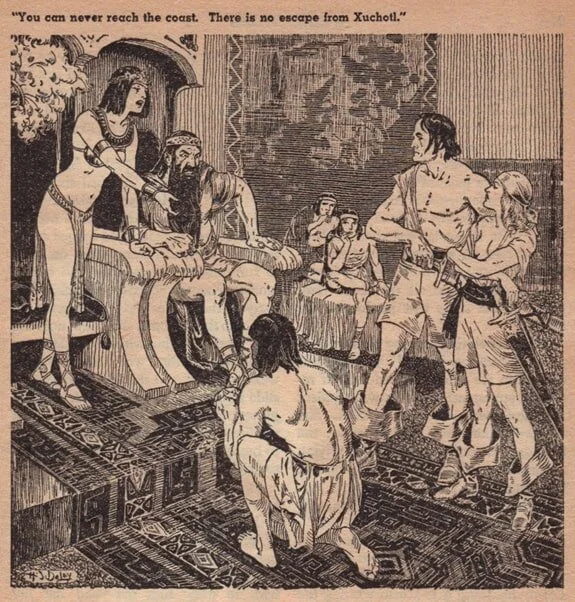 The hall ended in an ornate door, before which stood no guard. Without ceremony Techotl thrust the door open and ushered his friends into a broad chamber, where some thirty dark-skinned men and women lounged on satin-covered couches sprang up with exclamations of amazement.